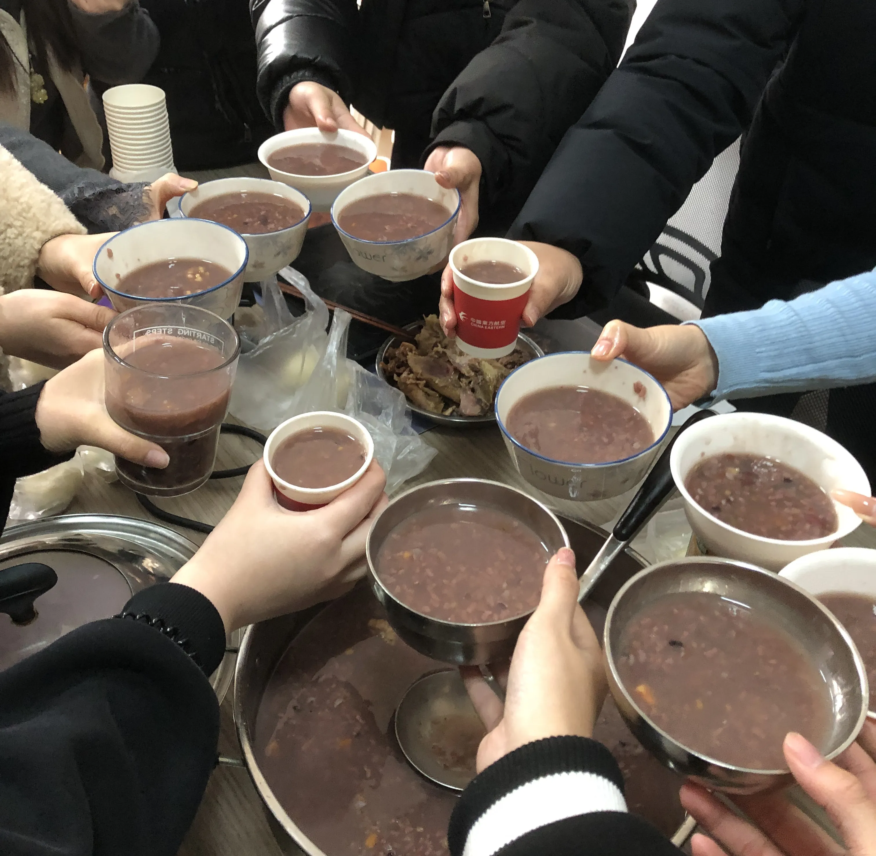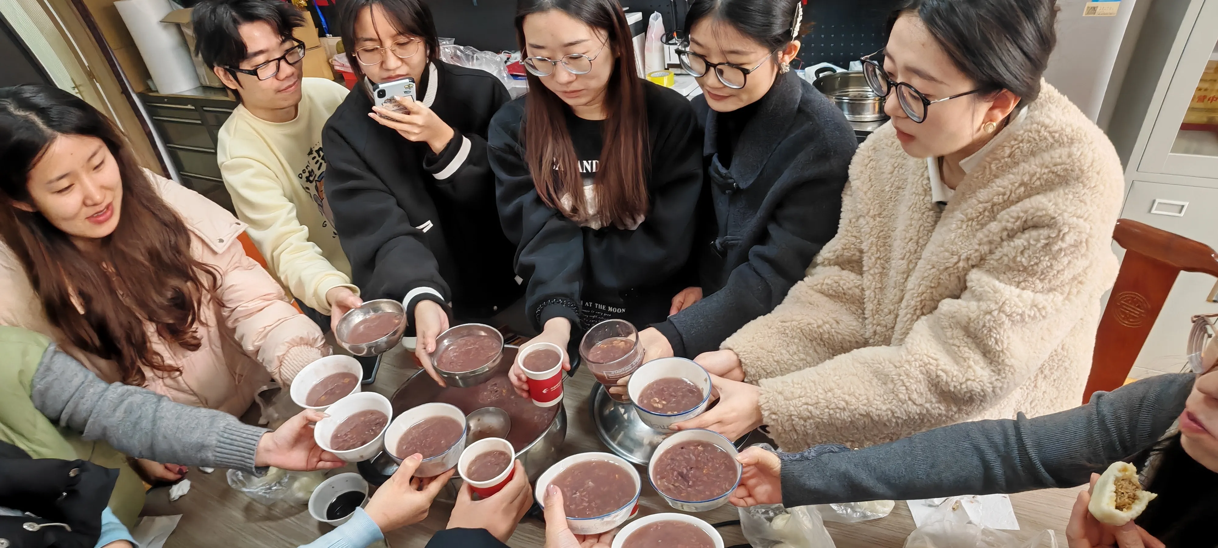 Haozhifeng Şirketinde çalışanlar sabah malzemeleri hazırladılar ve Laba Lapasını kendileri yaptılar. Öğlen saatlerinde ise buharda pişmiş çörekler eşliğinde sıcacık Laba Lapası yiyen herkes, birlikte keyifli dakikalar yaşadı. Haozhifeng Şirketi'nin tüm çalışanlarının bu kış boyunca mutlu ve güvende olmasını dilerim.